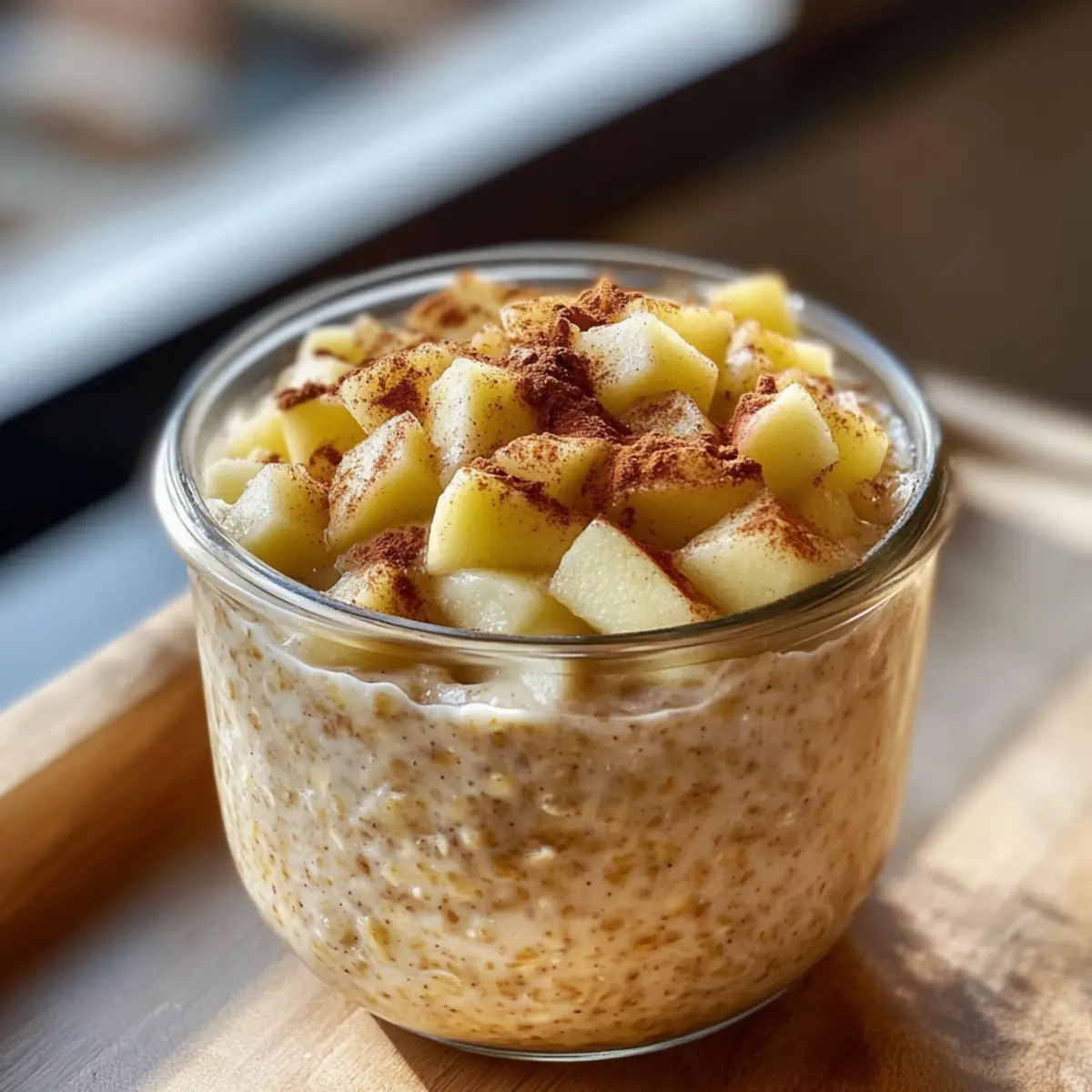 - Zutaten kombinieren: In einem Glasbehälter die Haferflocken, pflanzliche Milch, Protein-Pulver, Apfelwürfel, Zimt und Ahornsirup hinzufügen und gleichmäßig verteilen.