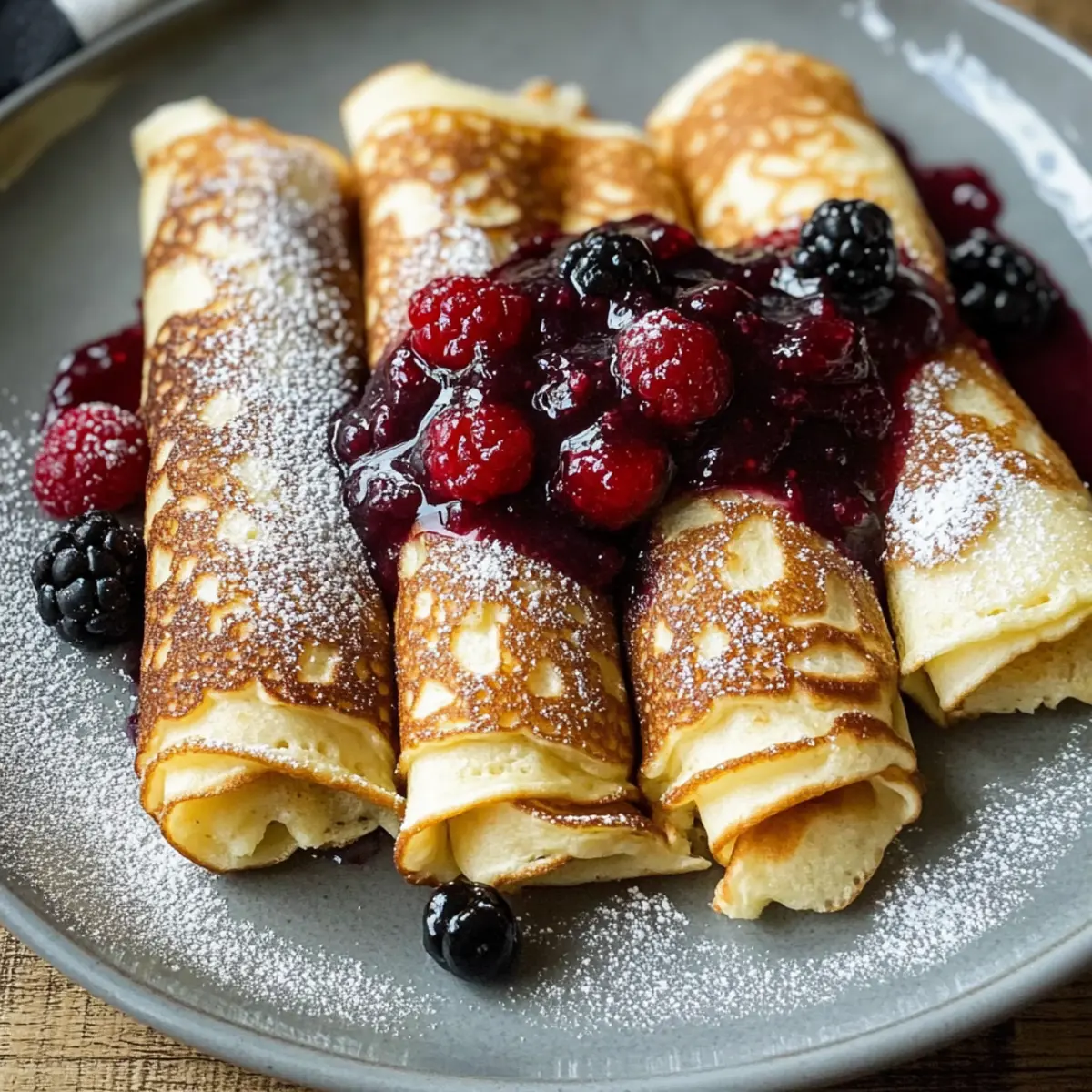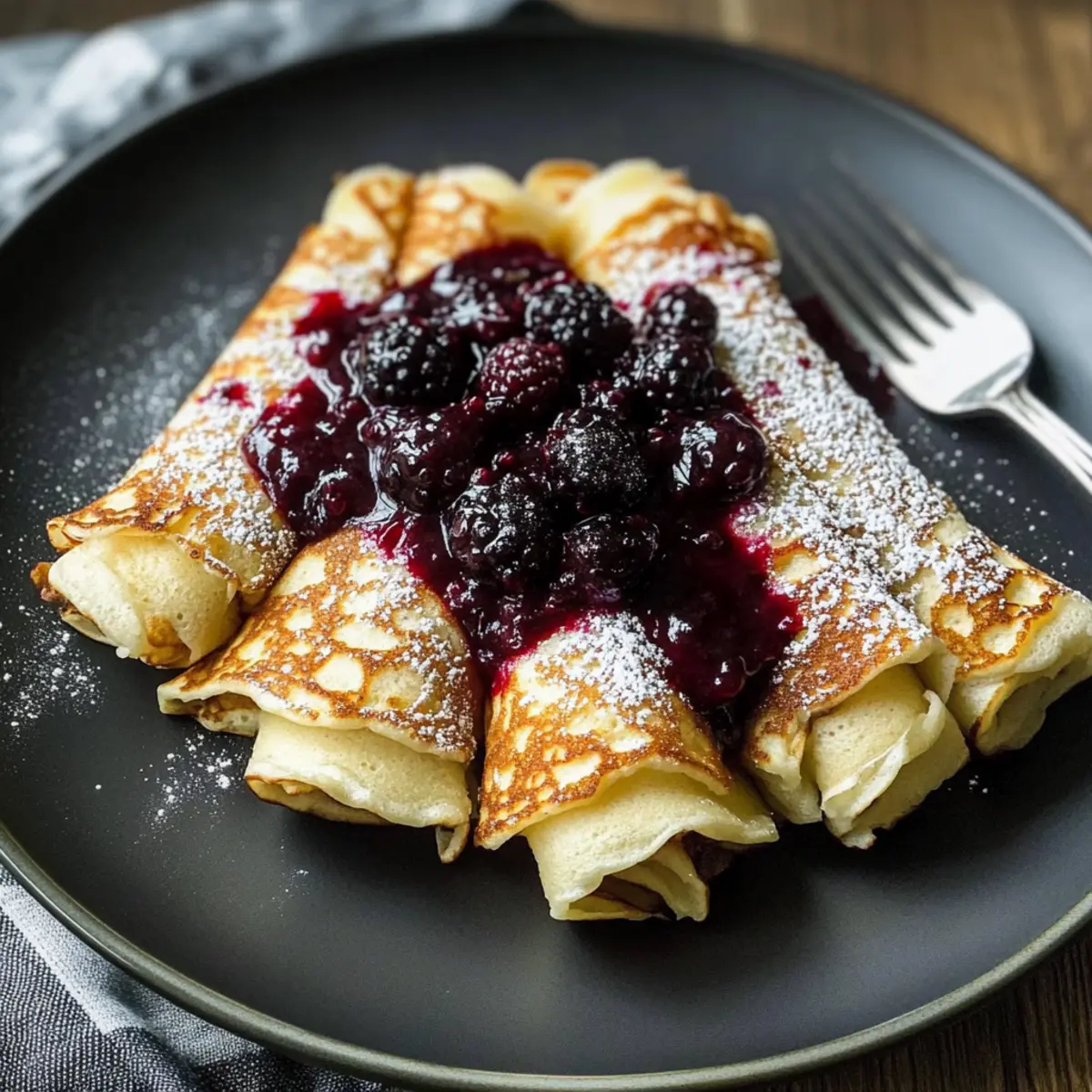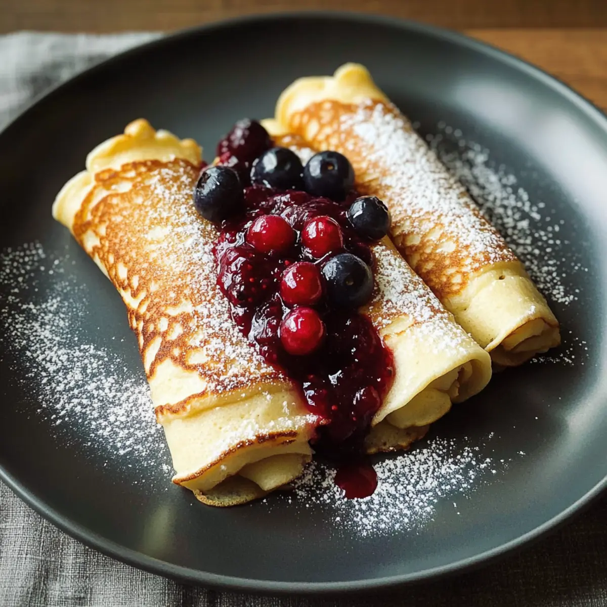 - Rolle die frischen, heißen Pfannkuchen auf und serviere sie sofort. Du kannst sie nach Belieben mit Puderzucker, einer fruchtigen Beerensauce oder Schlagsahne garnieren.