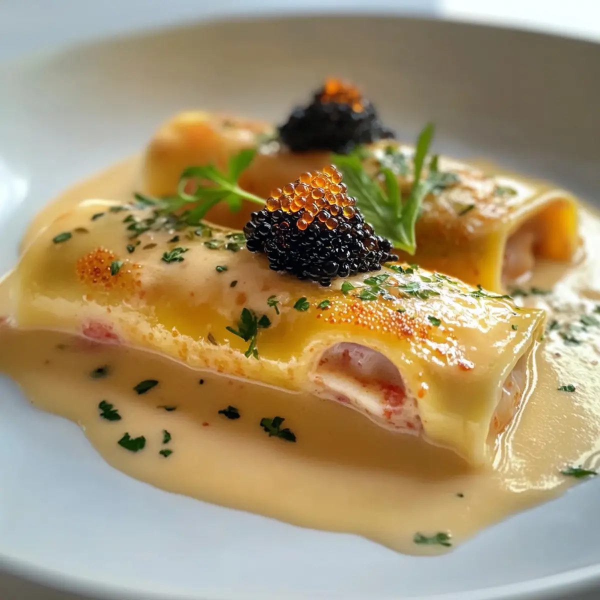 Langoustine-Cannelloni mit Hummersuppe verfeinert