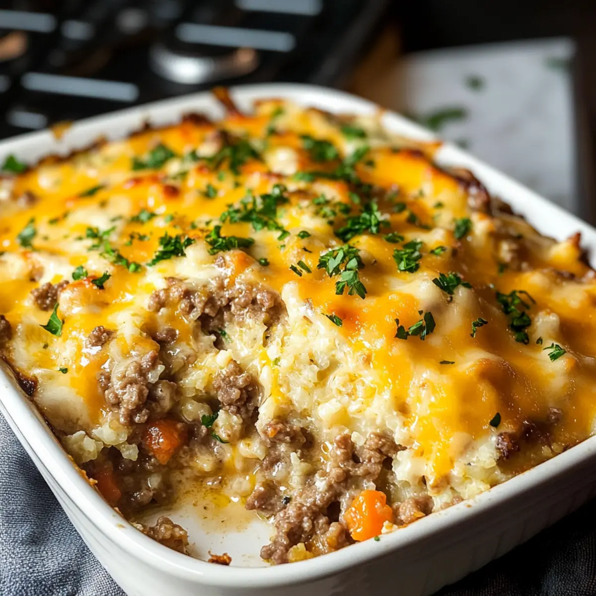 Käse-Hackfleisch- und Blumenkohlreis-Auflauf veganisiert