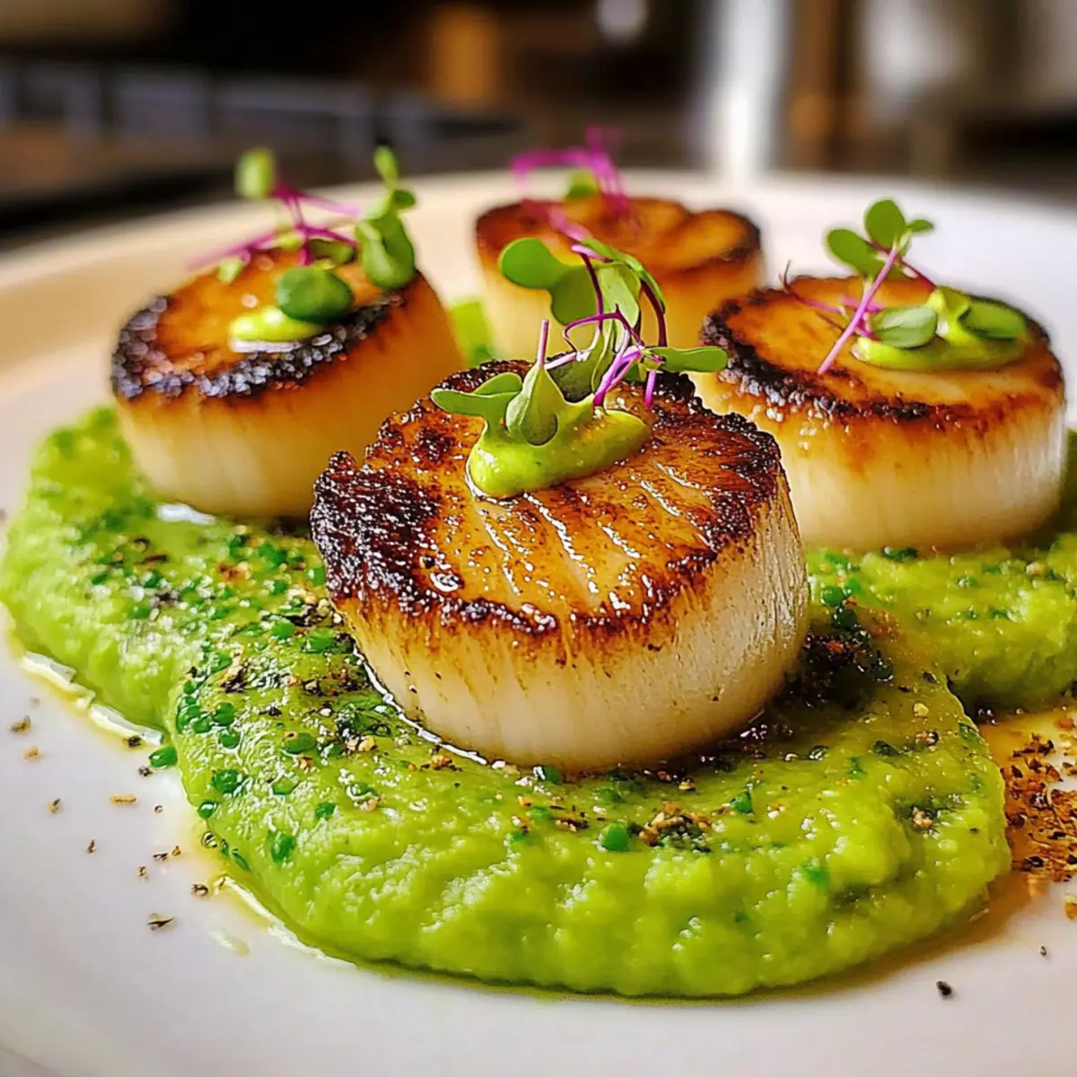 Gegrillte Jakobsmuscheln mit Erbsenpüree genießen