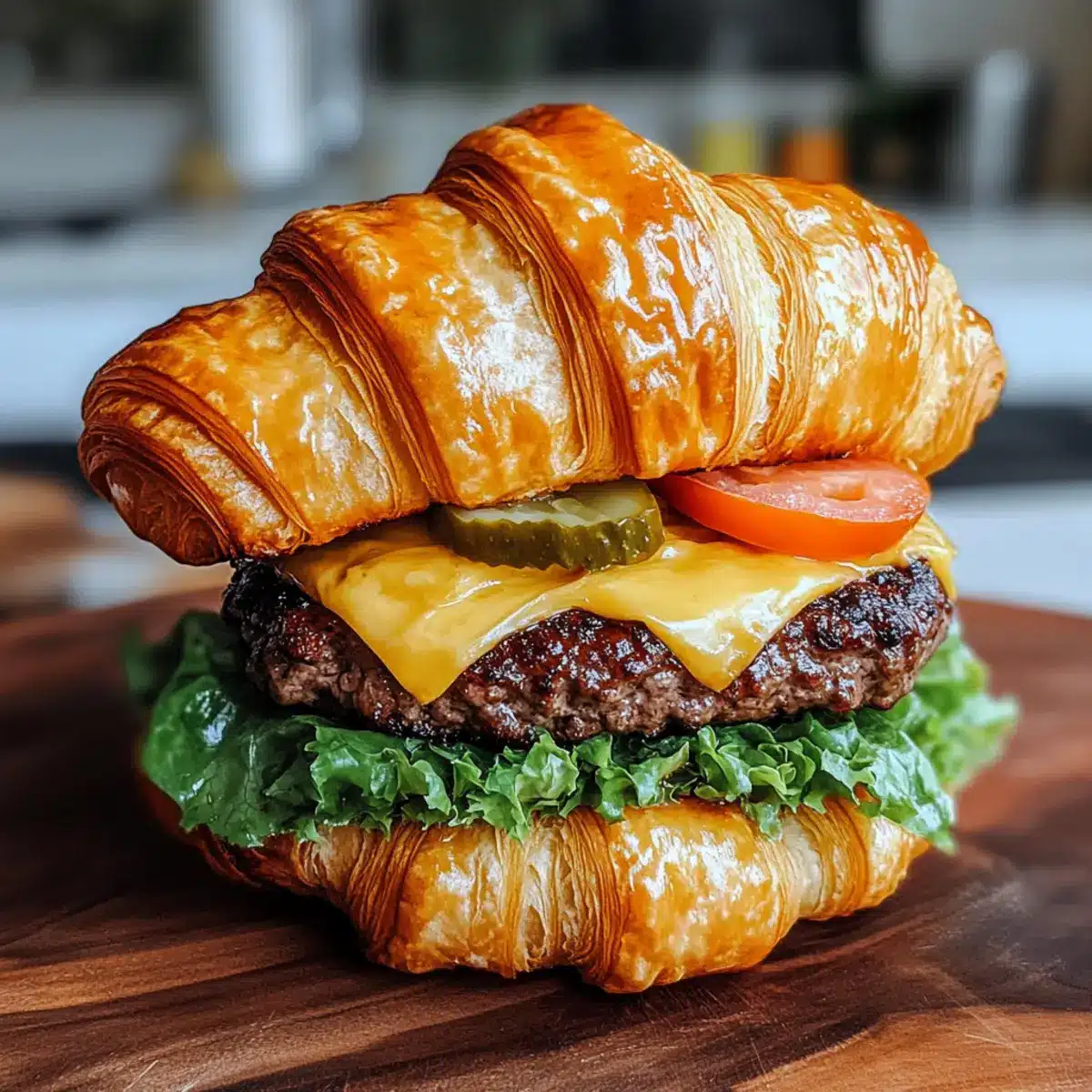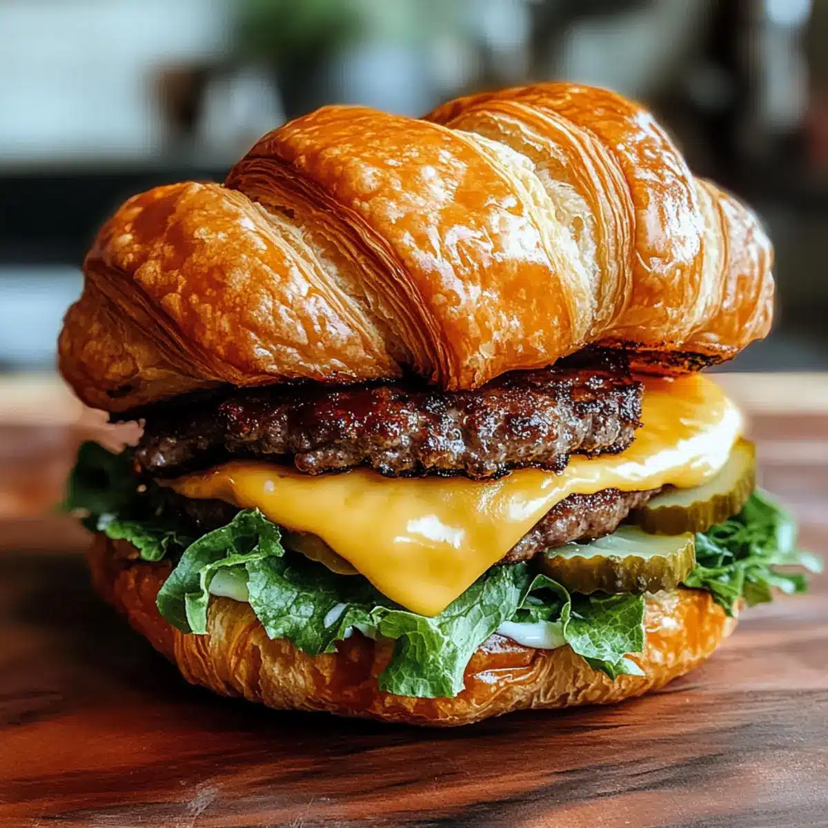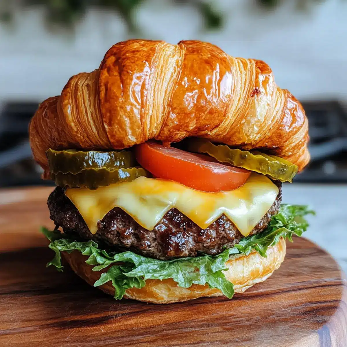 - Baue den Burger: Croissant-Boden, frisches Gemüse, Patty mit Käse, Gewürzgurken und Sauce hinzufügen.