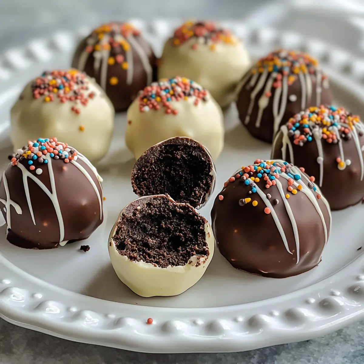 - Bevor die Schokolade vollständig fest ist, streue deine gewünschten Toppings wie zerbröselte Oreos oder bunte Streusel über die Trüffel.