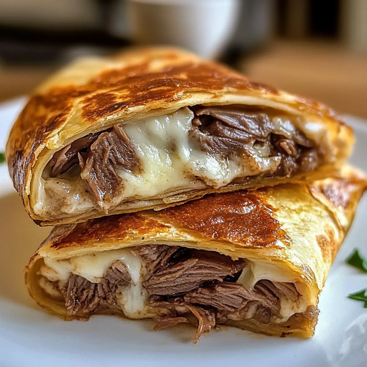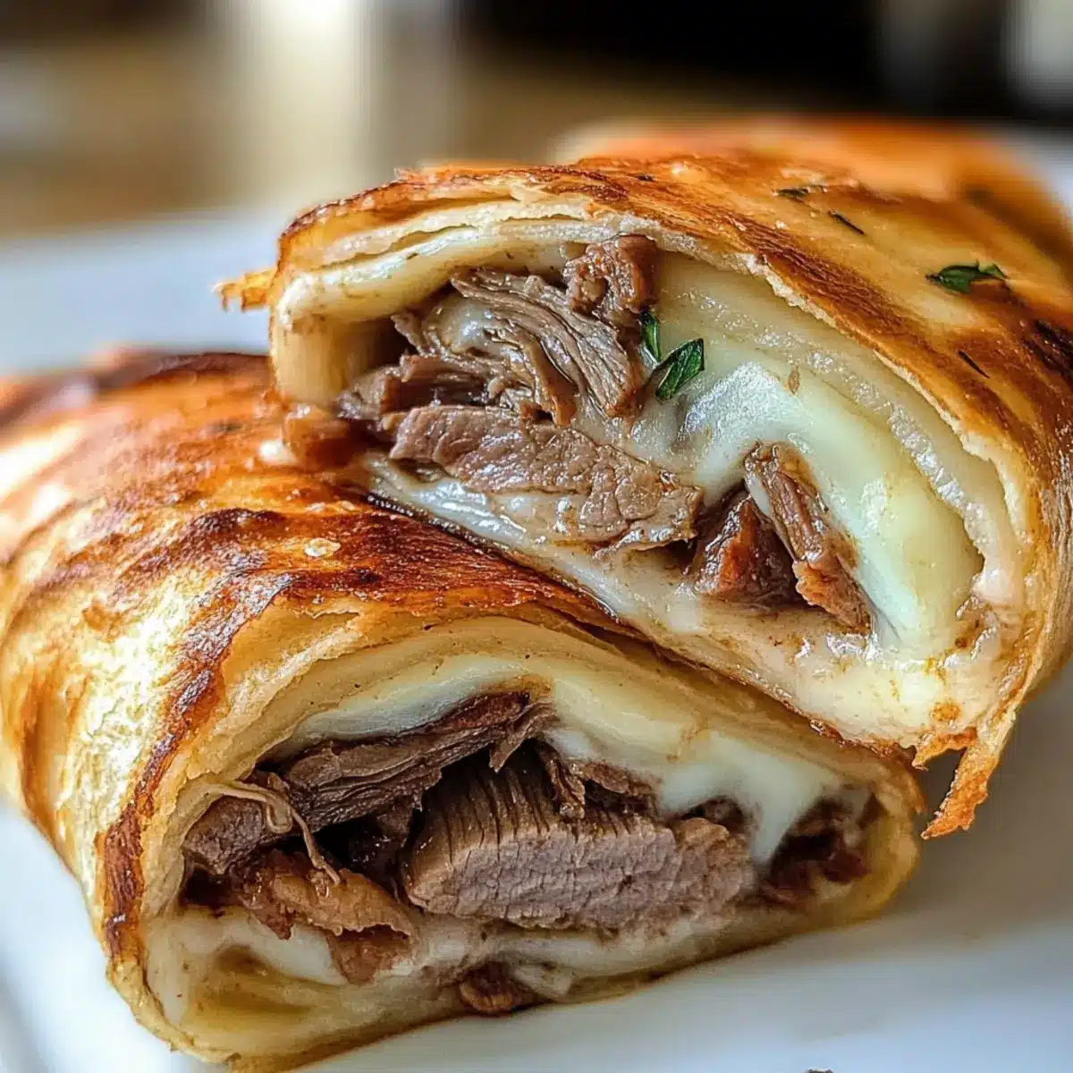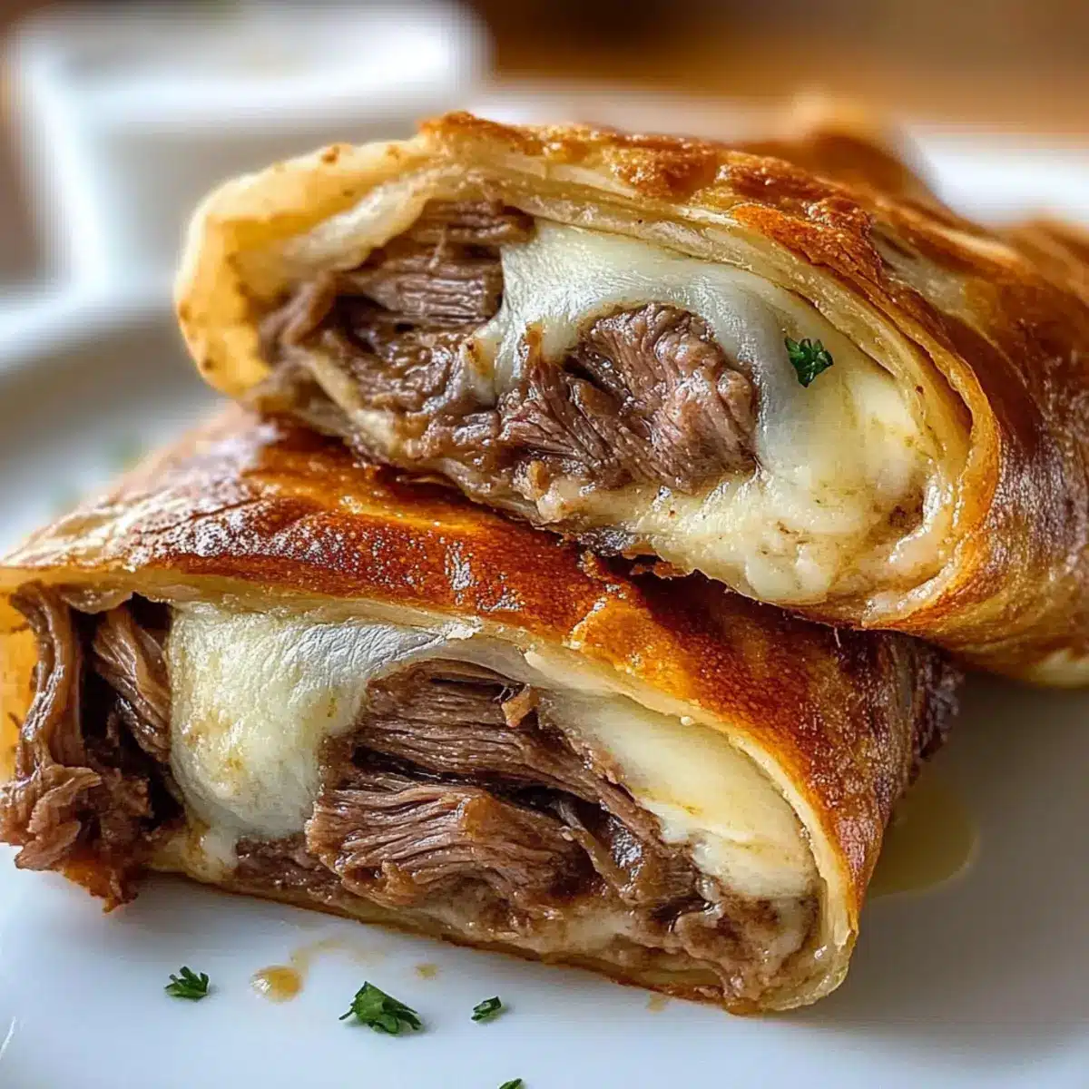 Lasse die Tortilla Rollen 2 Minuten ruhen, bevor du sie in Hälften oder Drittel schneidest. Die kurze Ruhezeit ermöglicht es dem Käse, sich zu setzen und die Füllung zu stabilisieren. Serviere die warmen Rollen sofort mit dem Au Jus zum Dippen und genieße einen köstlichen Snack, der deine Gäste begeistern wird!