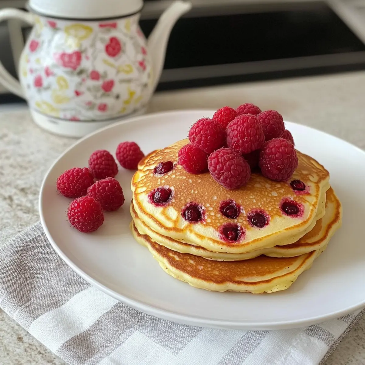 Köstlicher Genuss: Am Morgen verwöhnen diese fluffigen Pfannkuchen deinen Gaumen mit der Süße frischer Himbeeren und verwandeln jede Frühstücksroutine in ein Fest.