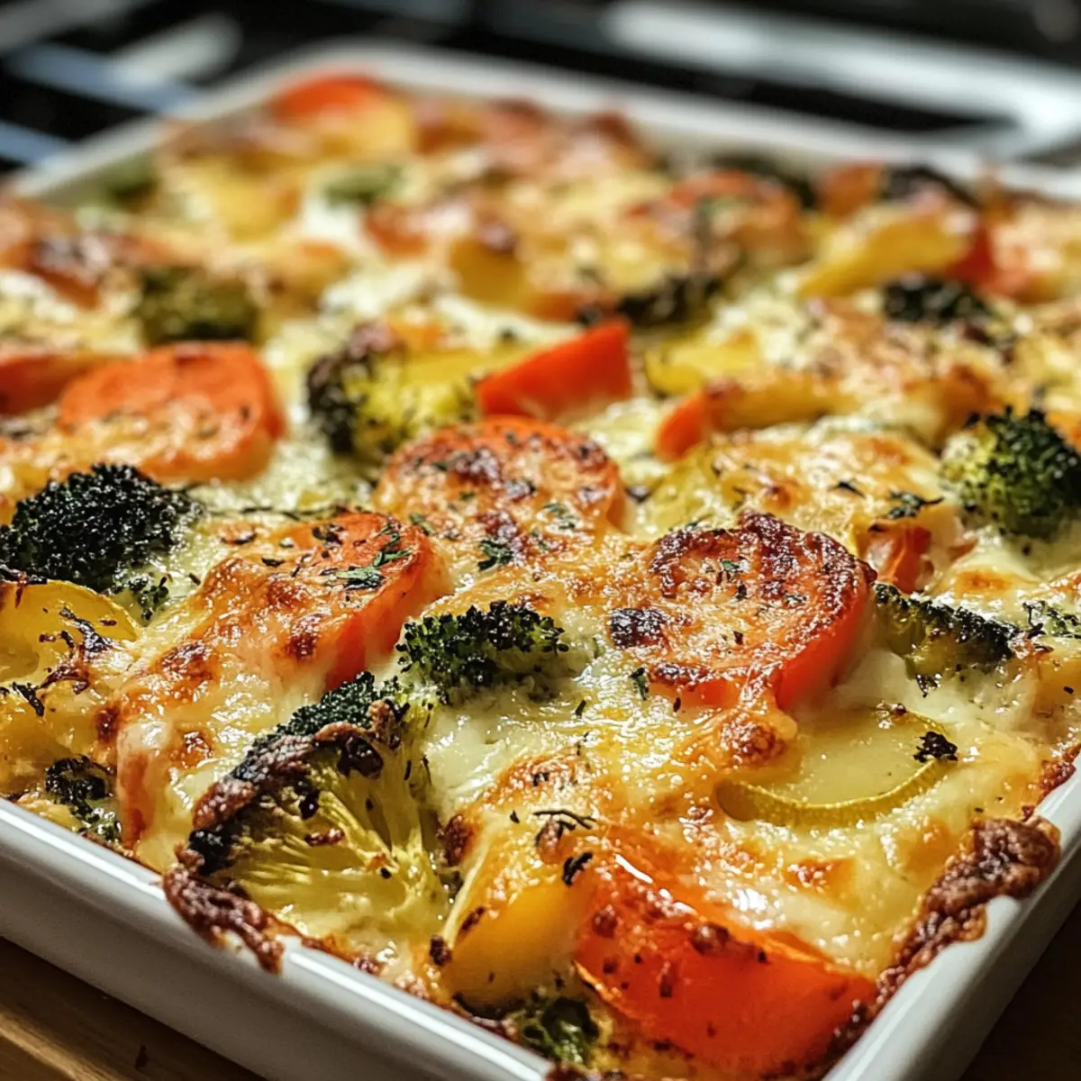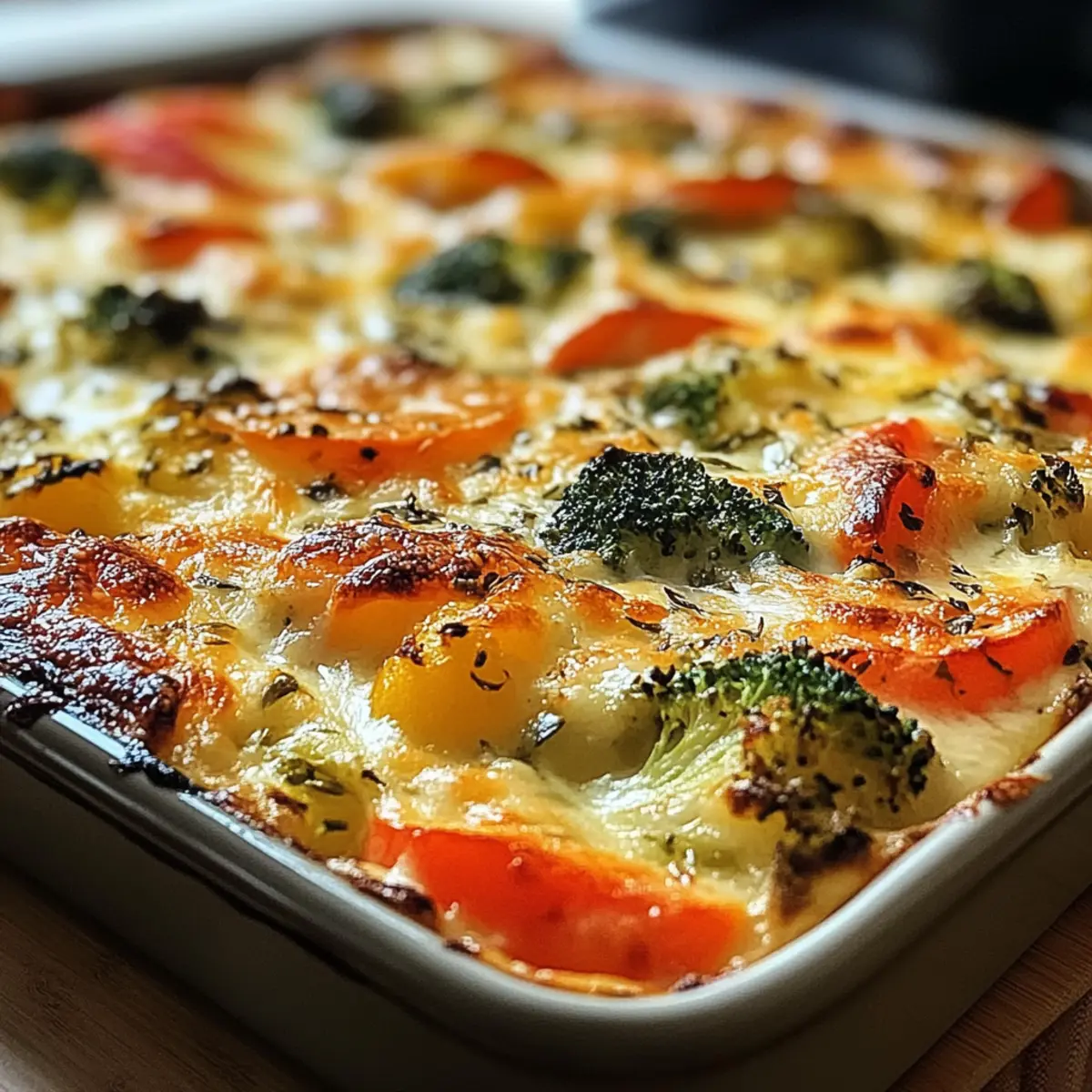 - Gieße die gesamte Gemüsemischung in die vorbereitete Auflaufform und verteile sie gleichmäßig. Streue den restlichen Cheddar-Käse darüber.