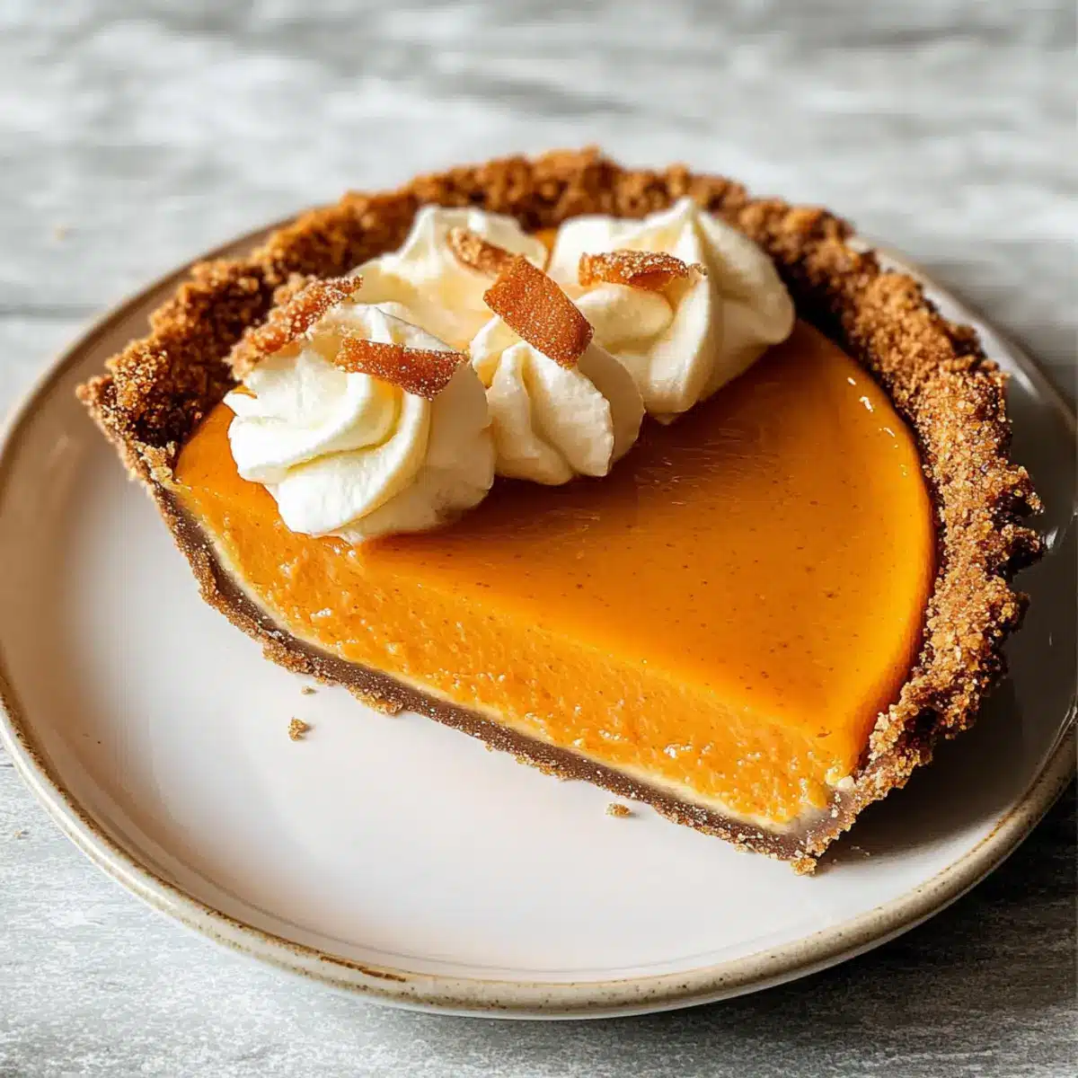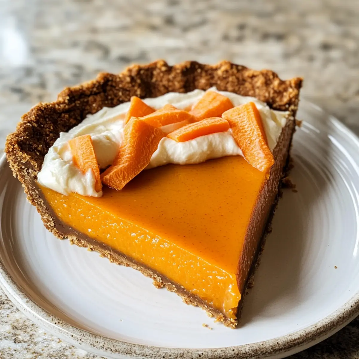 Lass den Pie nach dem Backen für mindestens eine Stunde abkühlen, damit die Füllung sich setzen kann. Optional kannst du ihn mit frischer Schlagsahne und kandierten Karotten garnieren, um eine schöne Präsentation zu erzielen, bevor du ihn servierst.