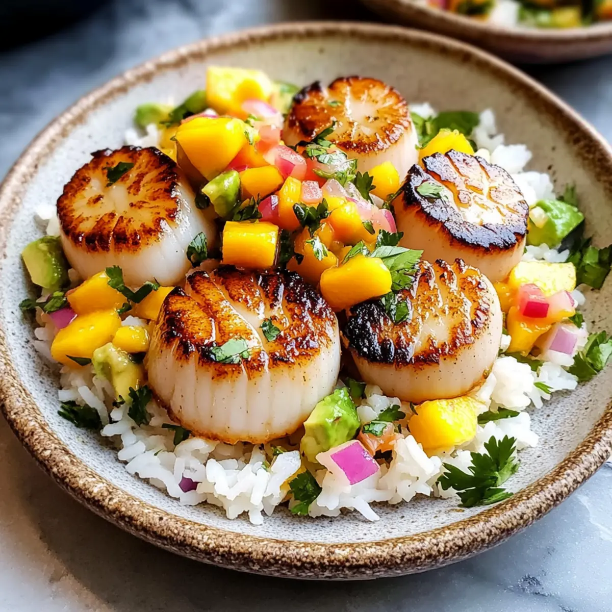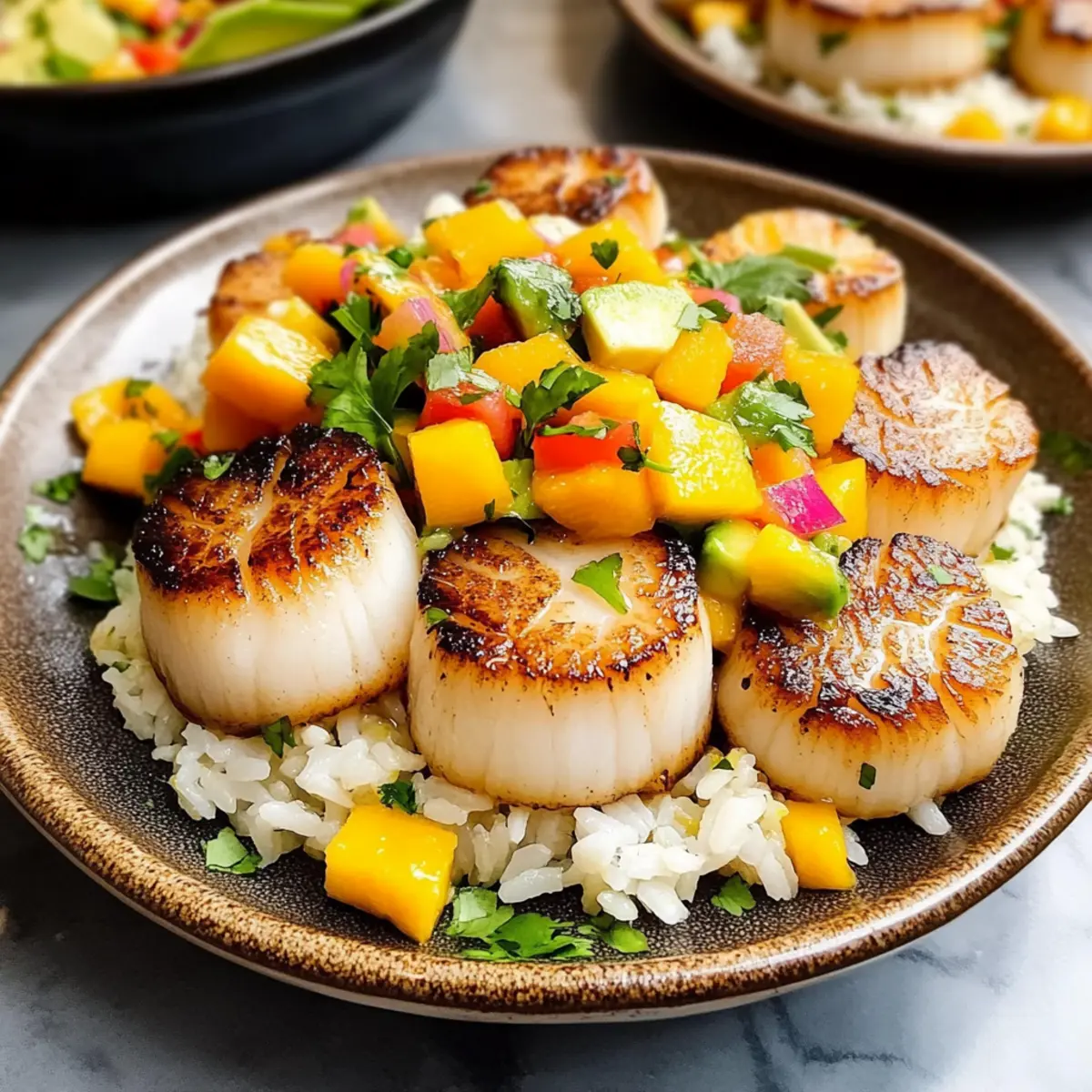 - Cremiger Kokosreis: Eine fluffige Grundlage, die die Aromen der Jakobsüßigkeiten ergänzt und harmonisch mit der frischen Salsa spielt.