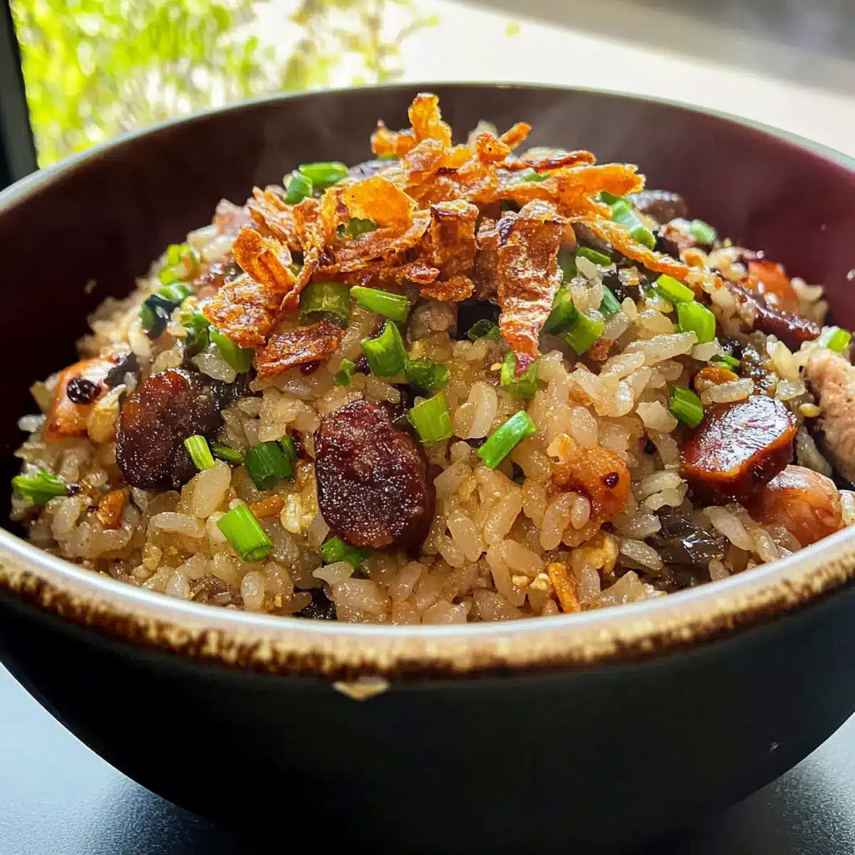 Einzigartiger Geschmack: Lo Mai Fan vereint die köstlichen Aromen von chinesischen Würstchen, getrockneten Garnelen und Shiitake-Pilzen, die dir sofort ein umami Erlebnis bieten.