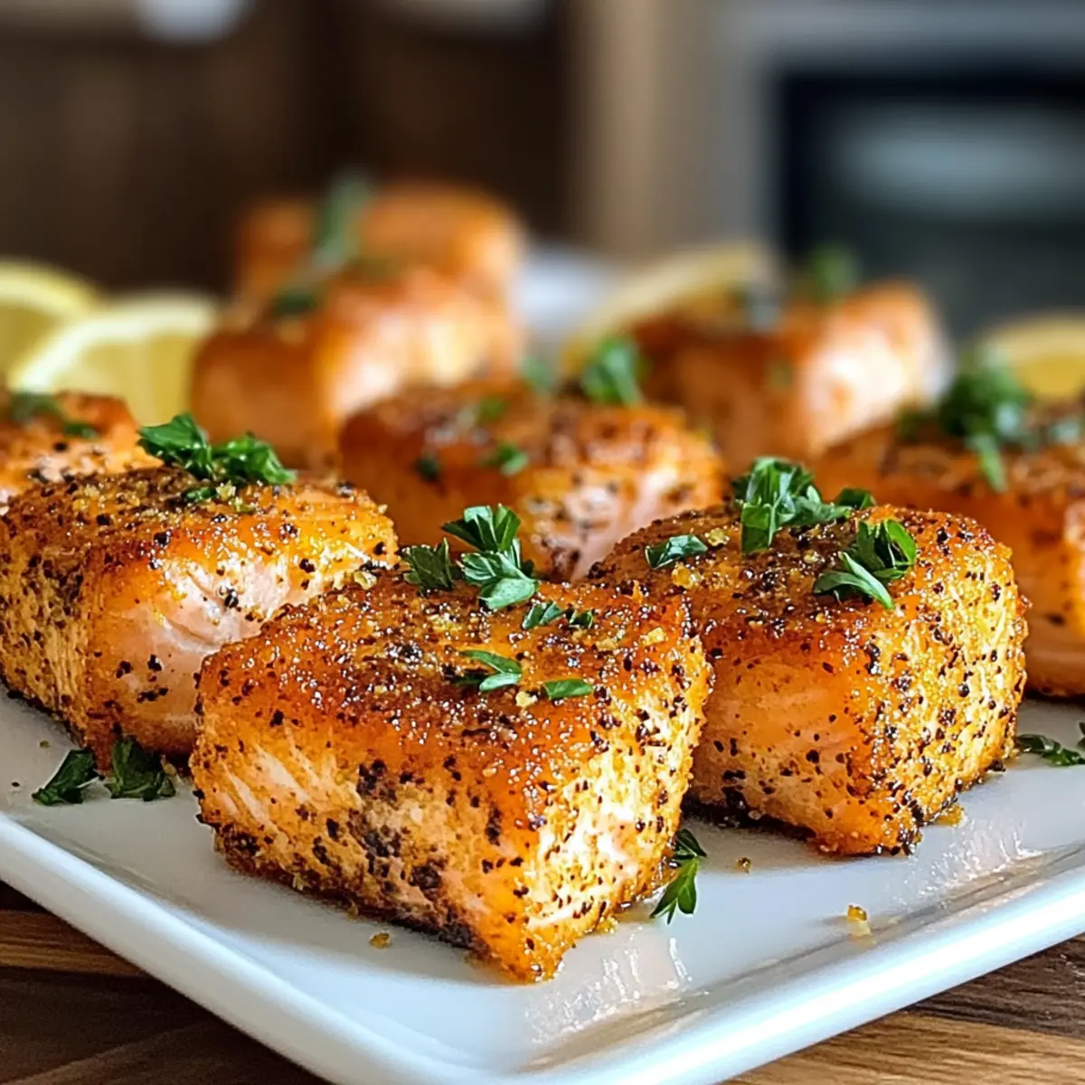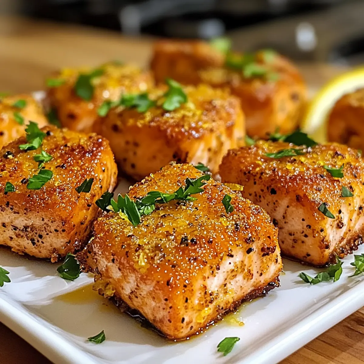 Nimm die knusprigen Heißluftfritteuse Zitronenpfeffer Lachs Bissen vorsichtig aus der Fritteuse und lege sie auf einen Servierteller. Garniere sie mit frischer Petersilie für zusätzlichen Geschmack und einen ansprechenden Look. Jetzt sind die Bissen bereit, um serviert und genossen zu werden!