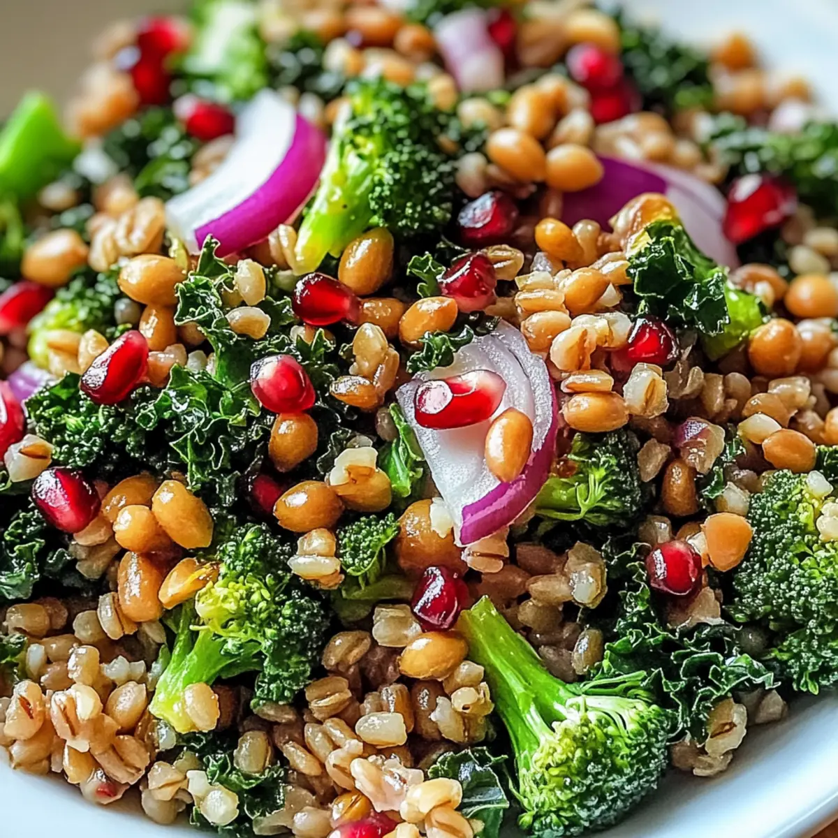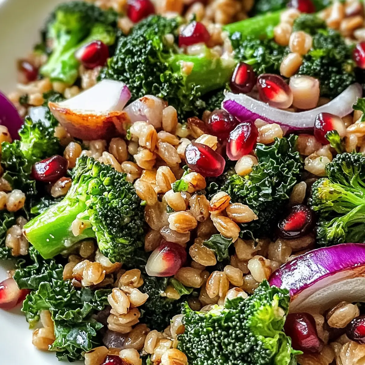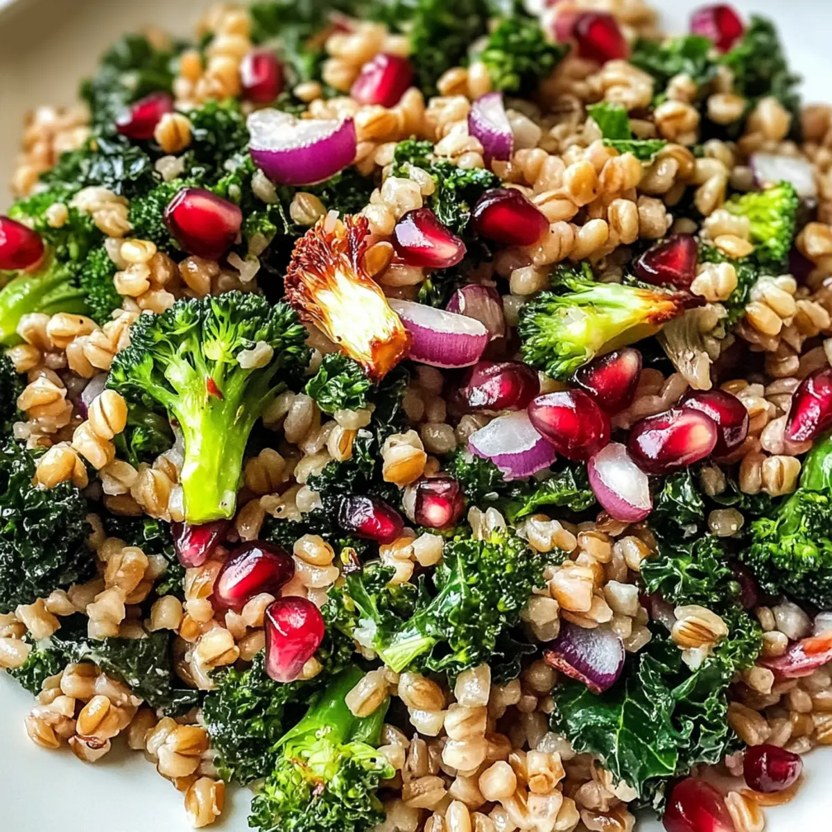 Farbe und Textur: Die Kombination von knackigem Grünkohl, zartem Farro und süßen Granatapfelkernen macht ihn zu einem visuellen Erlebnis.