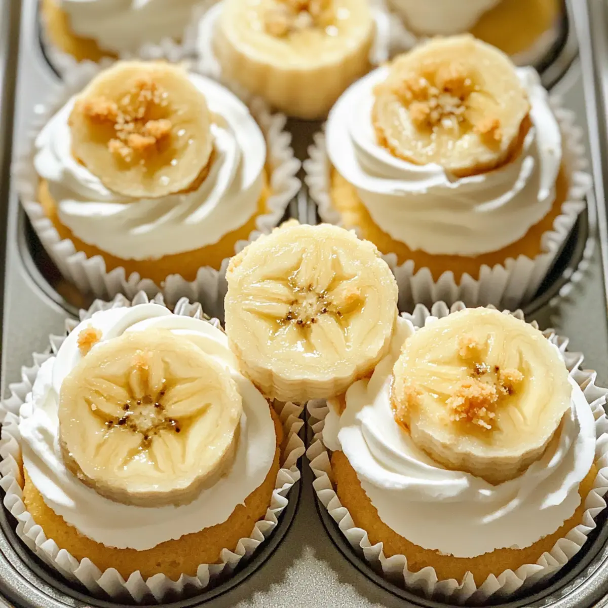 Vor dem Servieren toppe die Mini Bananenpudding-Käsekuchen mit Schlagsahne, zerbröselten Vanillewafern und frischen Bananenscheiben. Dies verleiht jedem Stück zusätzlichen Crunch und Frische. Achte darauf, die Bananenscheiben kurz vor dem Servieren hinzuzufügen, damit sie nicht braun werden und einen appetitlichen Look behalten.