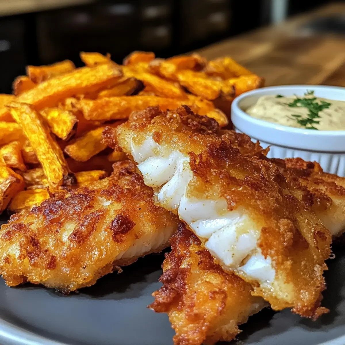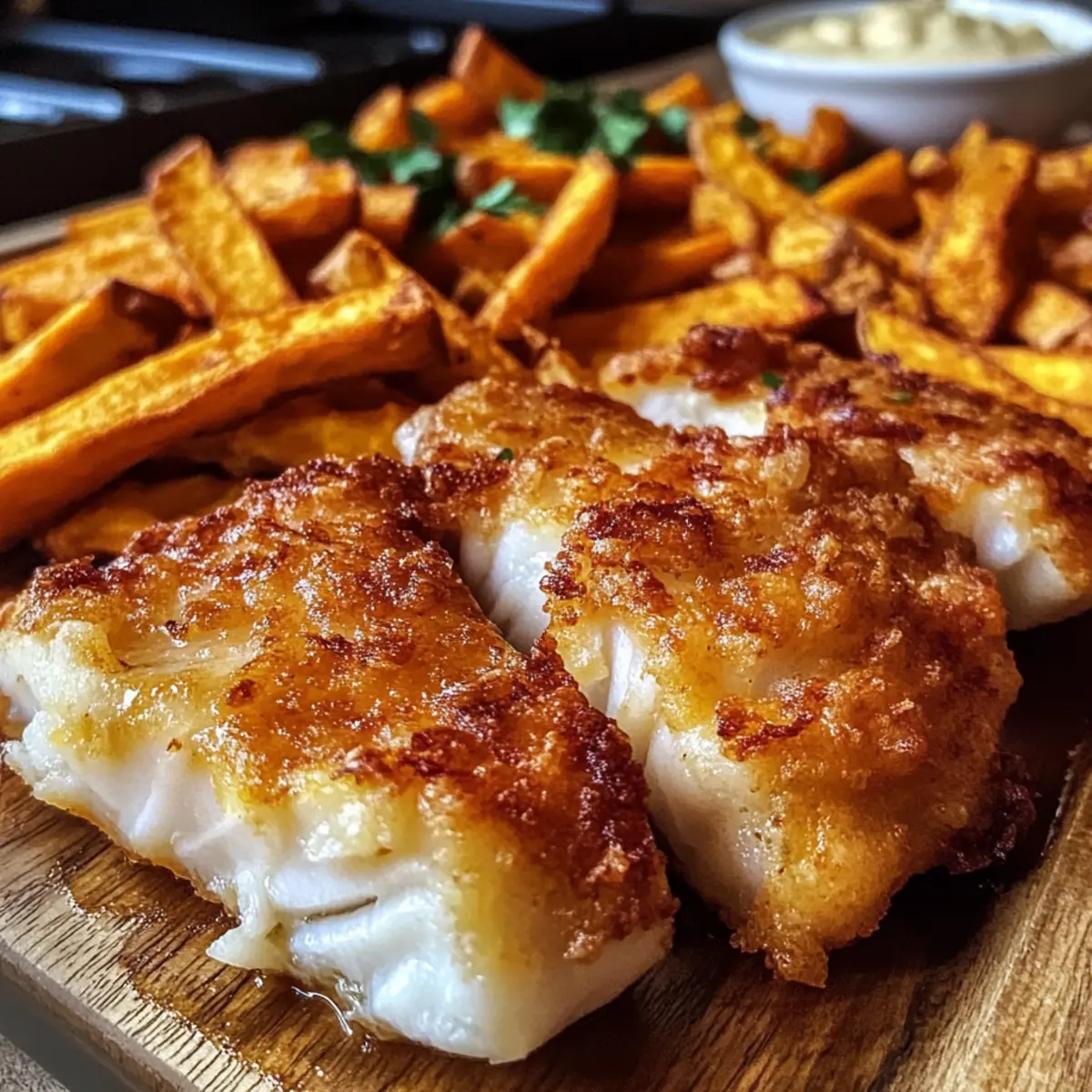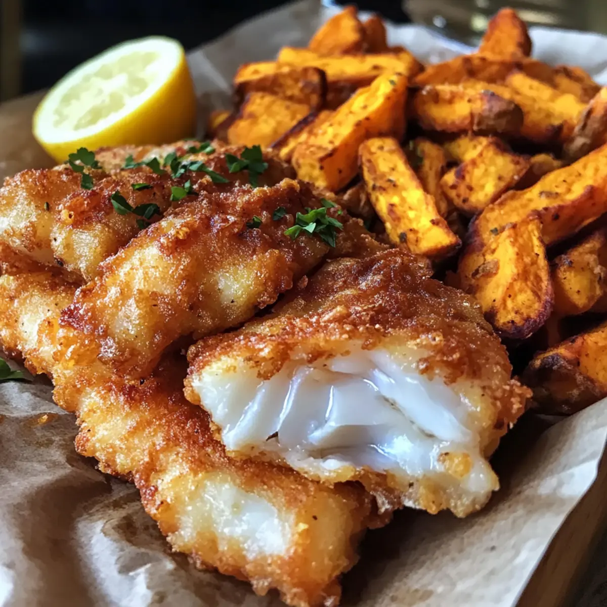 Crispy und lecker: Die Kombination von knusprigen Süßkartoffel-Pommes und zartem Fisch sorgt für ein unvergleichliches Geschmackserlebnis, das jeden Heißhunger stillt.