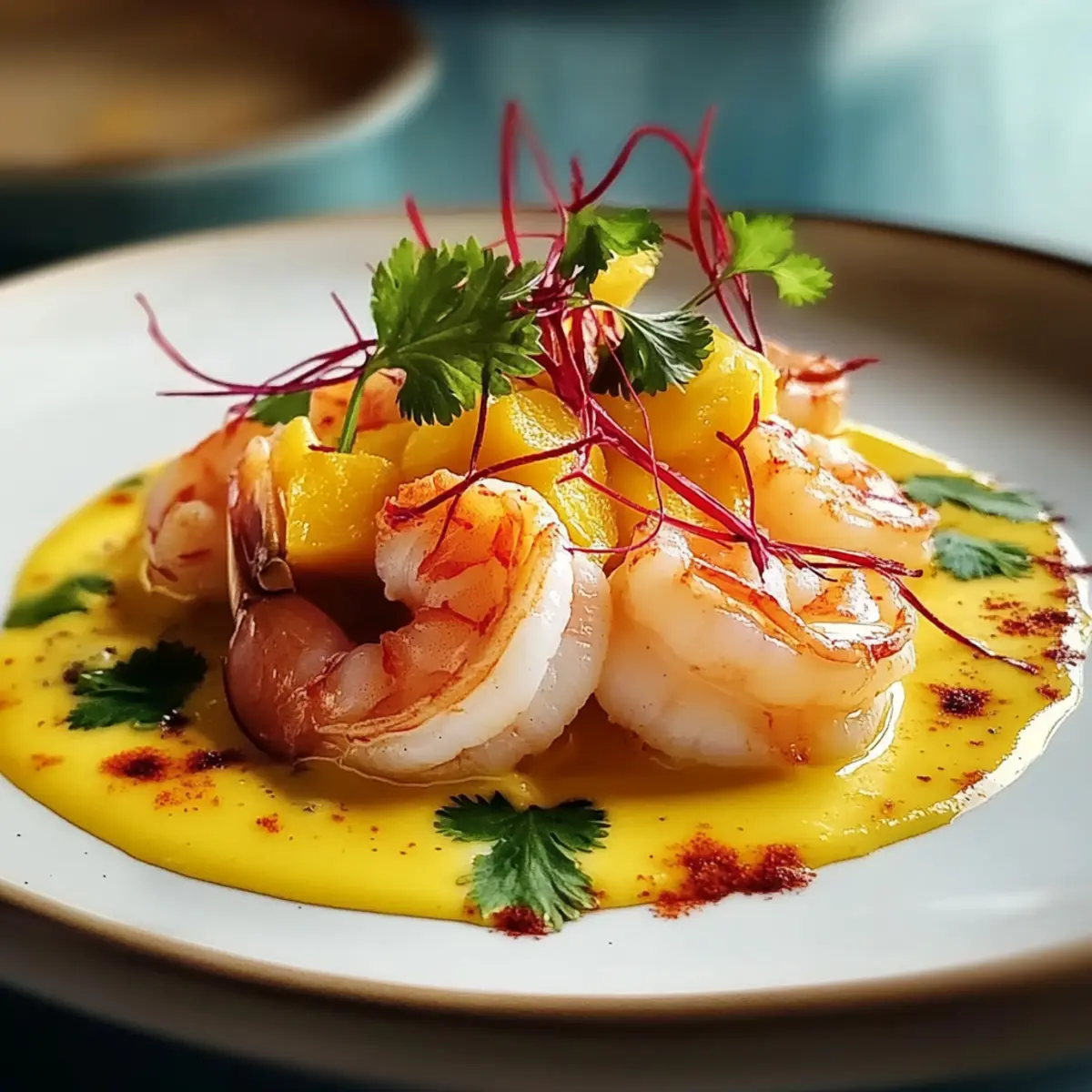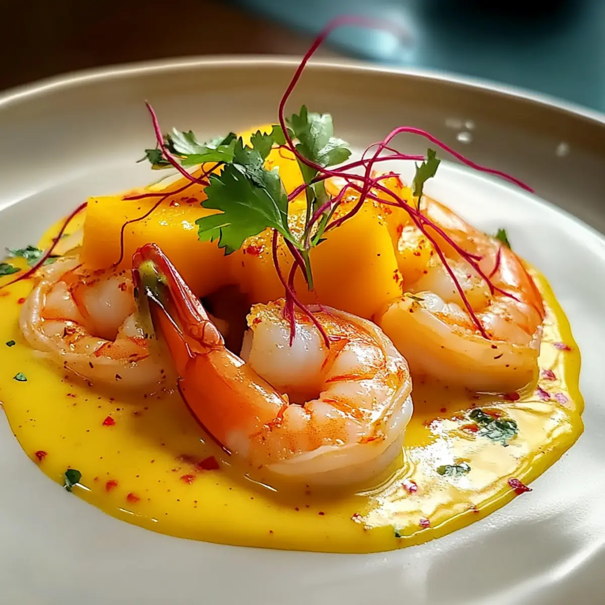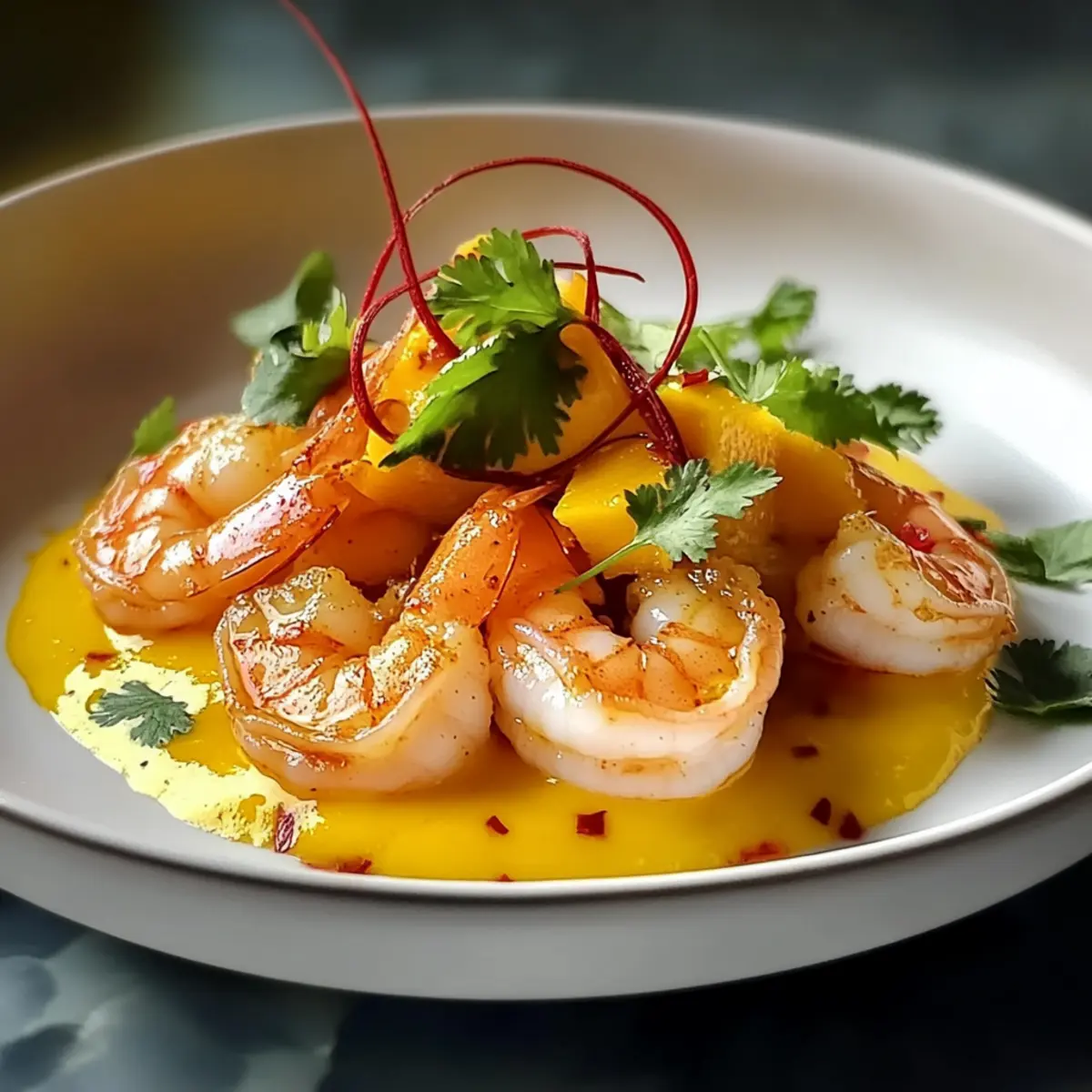 - Legen Sie einen großzügigen Löffel der Mango-Creme auf die Teller und arrangieren Sie die pochierten Garnelen elegant darauf. Bestreuen Sie das Gericht mit den Chili-Fäden und garnieren Sie es optional mit frischem Koriander.
