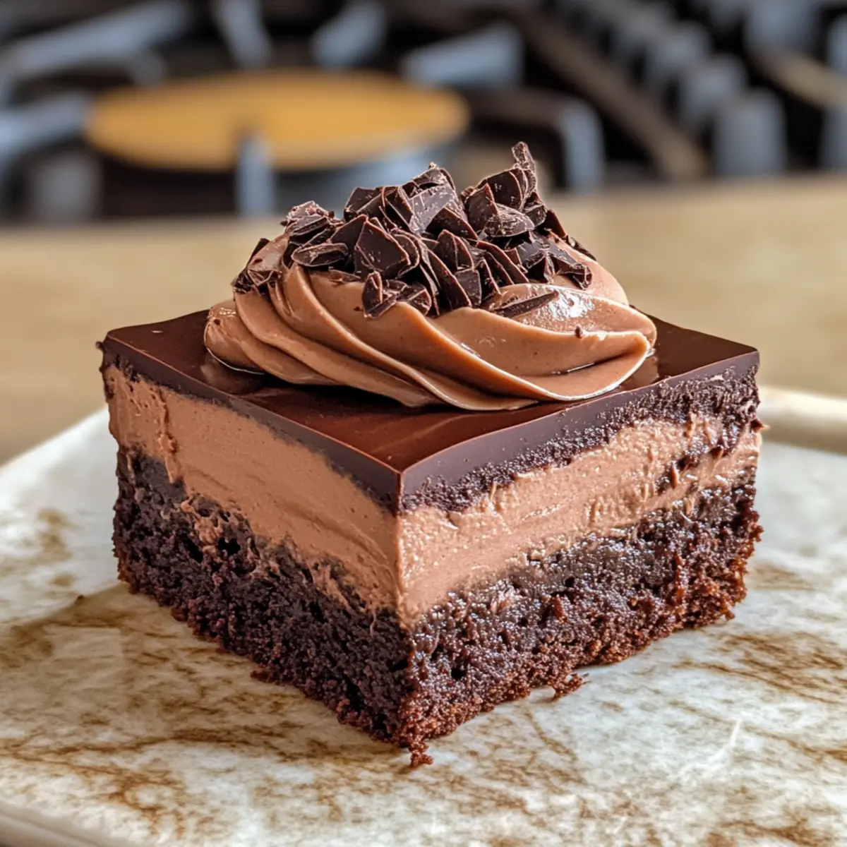 Himmlischer Genuss: Die Kombination aus fudgy Brownies, fluffiger Mousse und seidiger Ganache sorgt für ein unvergessliches Geschmackserlebnis, das Schokoladenliebhaber in ihren Bann ziehen wird.
