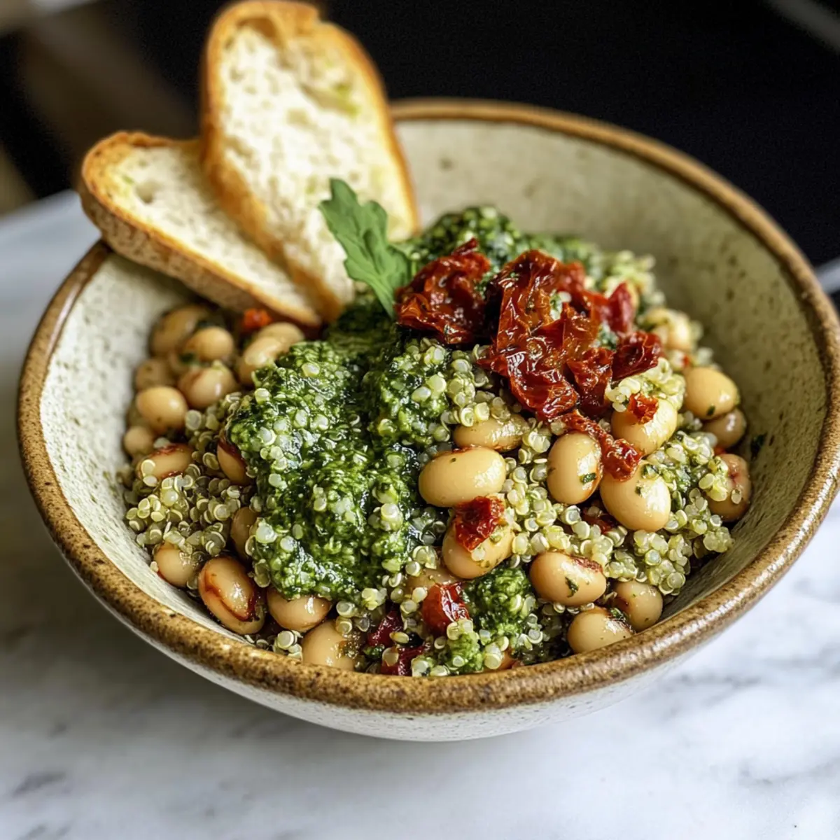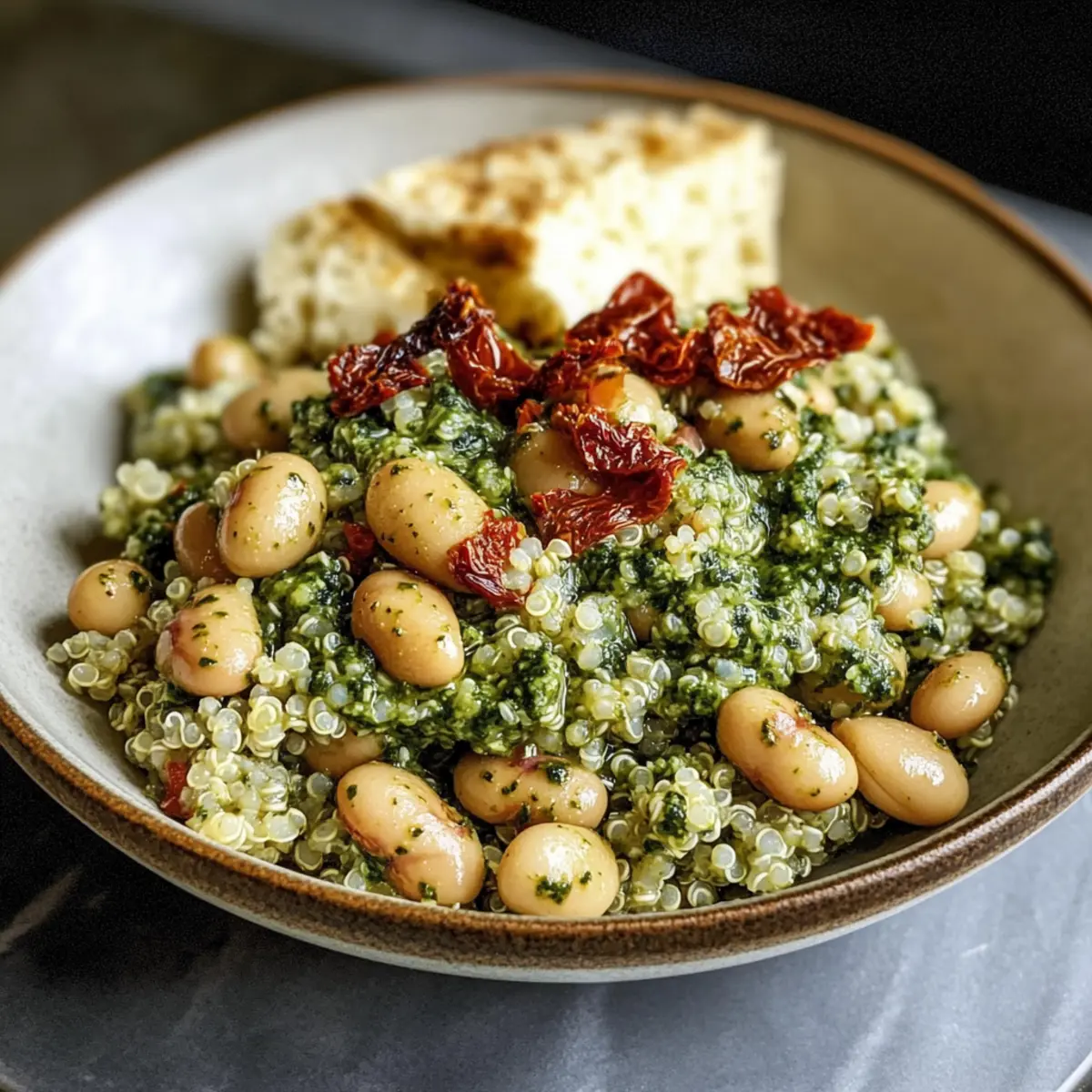 - Serviere die Spinat Pesto Butterbohne Linsen Quinoa Bowls sofort.