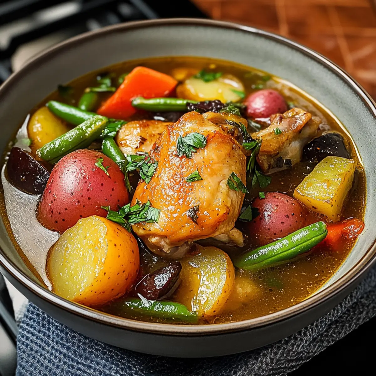 Lege die angebratenen Hähnchenschenkel wieder in den Topf und gieße die Hühnerbrühe dazu. Streue das koschere Salz, den schwarzen Pfeffer, die getrockneten Kräuter und die Lorbeerblätter hinein. Bring die Mischung zum Kochen, reduziere dann die Hitze und lass sie 10 Minuten sanft köcheln, um die Aromen zu vereinen.
