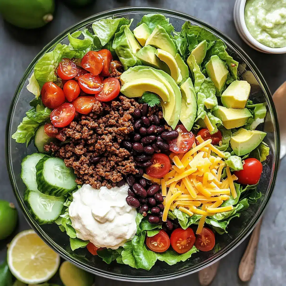 Cremige Guacamole: Verleiht dem Salat eine köstliche, cremige Note und harmoniert hervorragend mit den würzigen Aromen des Rinderhacks. Diese Kombination sorgt für einen intensiveren Geschmack, den niemand widerstehen kann.