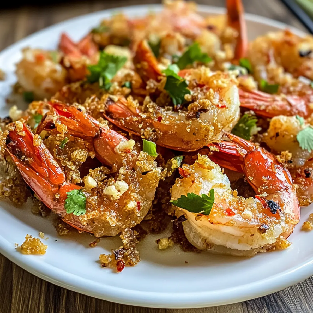 - Nimm die Garnelen aus der Pfanne und lasse sie auf einem Drahtgestell oder Küchenpapier abtropfen. Serviere die Garnelen sofort, bestreut mit der knusprigen Knoblauchmischung.